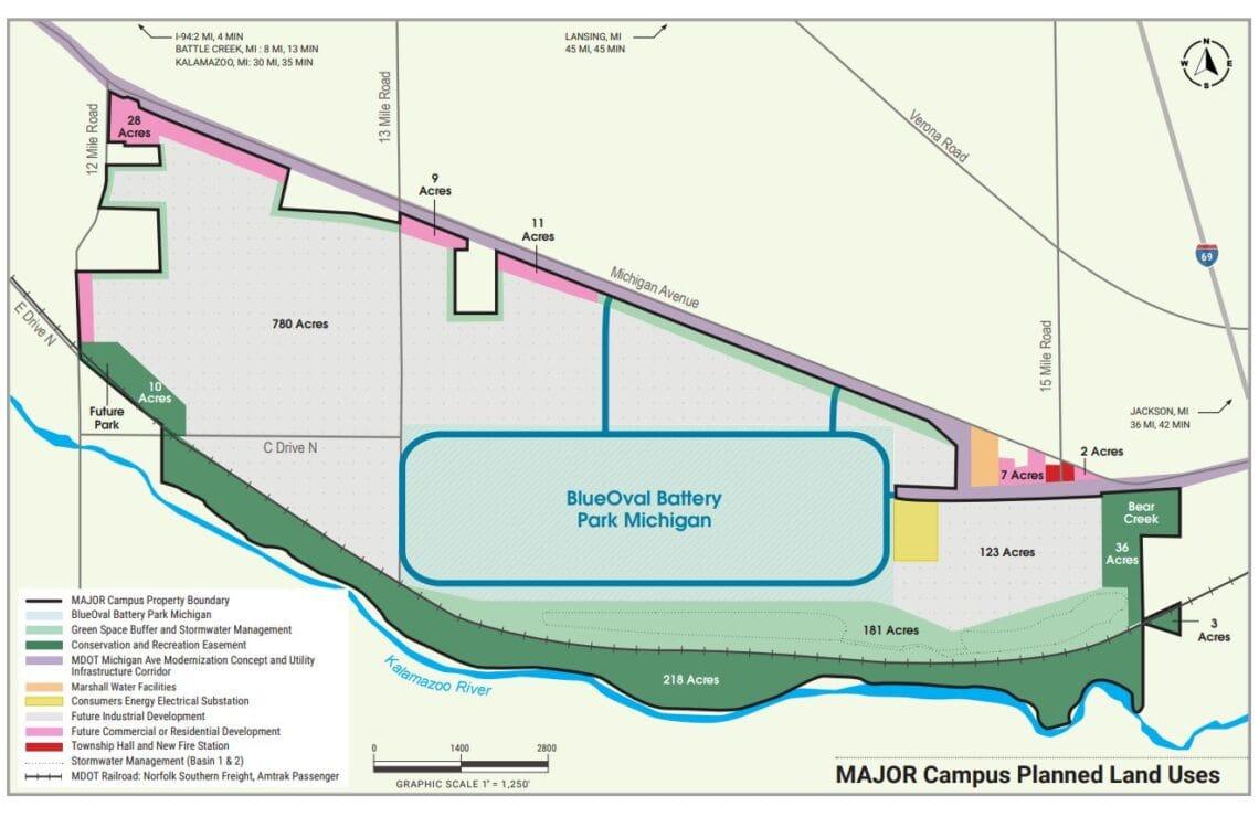 The MAJOR Campus includes Ford’s BlueOval Battery Park, a new advanced manufacturing facility occupying more than 500 acres east of 13 Mile Road. It will create 1,700 local jobs when it begins producing batteries for electric vehicles in 2026.