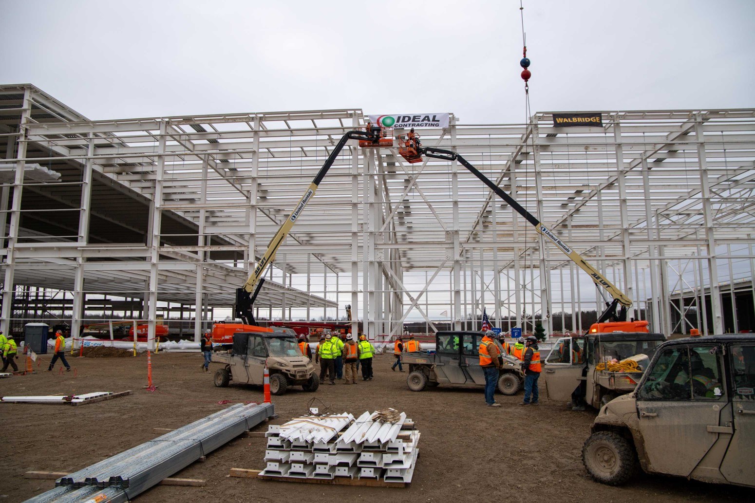 Through its wholly owned subsidiary, Ford in December completed steel construction on the primary facility, which is expected to begin production in 2026. The automaker hosted a ceremony to mark the milestone by putting into place the final beam signed by team members along with a U.S. flag and a tree for good luck. Construction continues on other BlueOval Battery Park buildings at the site as well as inside the plant.