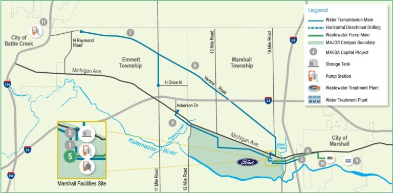 A Sanitary Pump Station (SPS) will be constructed at the Marshall Facilities Site located south of Michigan Avenue and west of 15 Mile Road. The SPS consists of a 12-foot diameter precast concrete wet well with three (3) submersible pumps each rated at 800 gallons per minute (gpm).