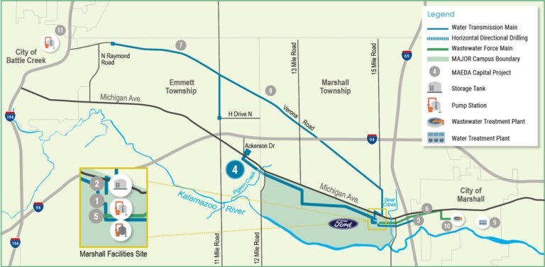 The Battle Creek/Emmett Township Water Transmission Main is a 4-mile long, 20-inch diameter pipeline beginning at Ackerson Drive just east of FireKeepers Casino and extending along the south side of Michigan Avenue to the Marshall Facilities Site near 15 Mile Road.